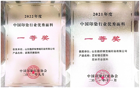 近日,由中国印染行业协会主办的“龙盛·第二十届全国印染行业新材料、新技术、新工艺、新产品技术交流会”在杭州举行。活动现场,公布了中国印染行业优秀面料获奖产品和企业名单,山东魏桥特宽幅印染有限公司参评作品“部落风情”荣获2022年度中国印染行业优秀面料一等奖,“层林尽染”“夏夜情话”荣获2021年度中国印染行业优秀面料一等奖。