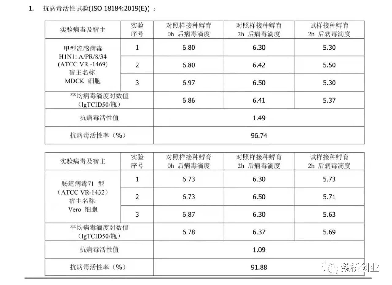 该面料生产采用高安全性的抗菌抗病毒材料,对人体皮肤无刺激性,细胞毒性低,根据GB18401-2010国家纺织产品基本安全技术规范 B类测试均合格。抗菌抗病毒性能良好,对金黄色葡萄球菌和大肠杆菌的抑菌率均达99%以上,对甲型流感病毒H1N1、肠道病毒71型、人冠状病毒Hcov-229E的抗病毒活性率分别为96.74%、91.88%、93.63%。