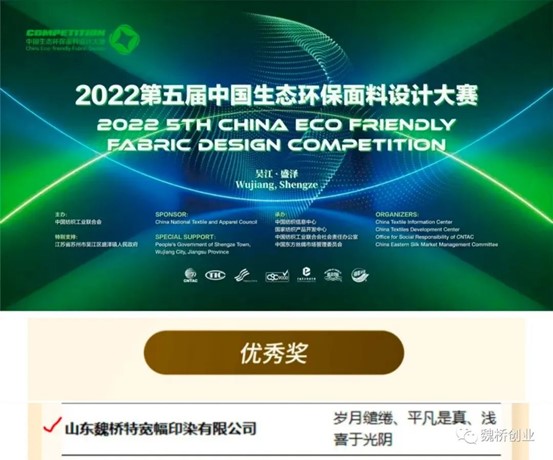 近日,2022第五届中国生态环保面料设计大赛获奖名单发布,山东魏桥特宽幅印染有限公司参评的“岁月缱绻、平凡是真、浅喜于光阴”三款面料荣获大赛优秀奖。