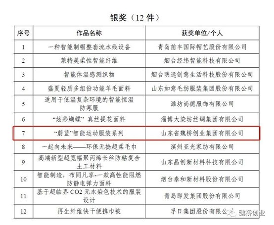 日前,山东省工业和信息化厅公布了山东省第四届“省长杯”工业设计大赛和“省长杯”工业设计大赛第一届纺织服装分赛获奖名单。魏桥创业集团“蔚蓝”智能运动服装系列产品荣获“省长杯”工业设计大赛第一届纺织服装分赛银奖。