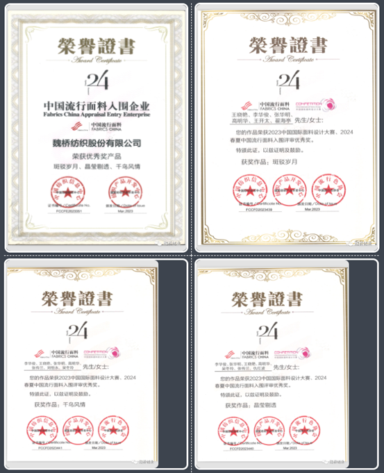 魏桥纺织多款产品荣获第49届(2024春夏)中国流行面料入围评审获奖名单
