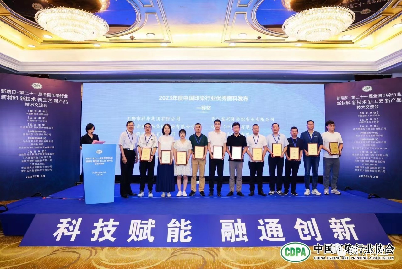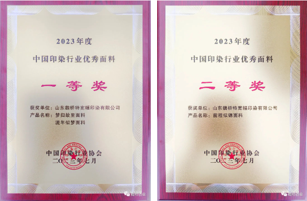 近日,由中国印染行业协会主办的“新瑞贝·第二十一届全国印染行业新材料、新技术、新工艺、新产品技术交流会”在上海隆重召开。山东魏桥特宽幅印染有限公司参评产品“流年似梦”“梦归故里”荣获2023年度中国印染行业优秀面料一等奖,产品“前程似锦”荣获二等奖。