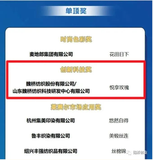 8月14日,中国纺织信息中心通过“中国流行面料”Fabrics China微信公众号,重磅揭晓了“2023中国时尚面料设计大赛”获奖名单,魏桥纺织股份有限公司设计研发产品“悦享玫瑰”荣获该大赛创新科技奖,“水墨江南”“蓝色星空”产品获大赛优秀奖。