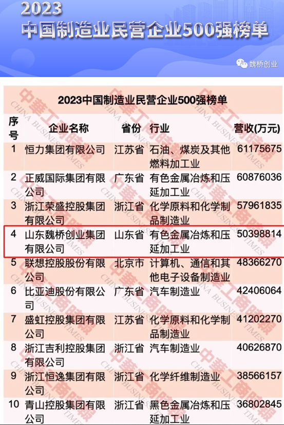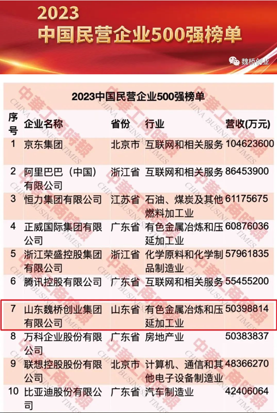 9月12日上午,2023中国民营企业500强峰会暨全国优强民营企业助力山东绿色低碳高质量发展大会在济南召开。会议发布了2023中国民营企业500强和中国制造业民营企业500强榜单,山东魏桥创业集团有限公司分列第7位和第4位,在上榜山东企业中均居首位。