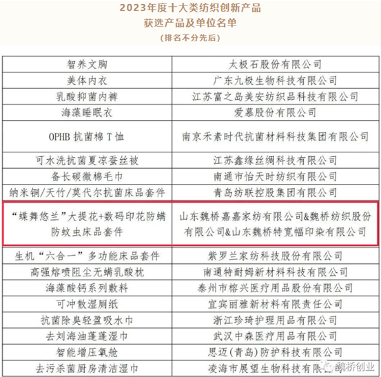 11月8日,中国纺织工业联合会下发决定,授予163件产品“2023年度十大类纺织创新产品”称号。由魏桥纺织股份有限公司联合山东魏桥嘉嘉家纺有限公司、山东魏桥特宽幅印染有限公司共同申报的“蝴蝶悠兰”大提花+数码印花防螨防蚊虫套件荣获“2023年度十大类纺织创新产品”称号。