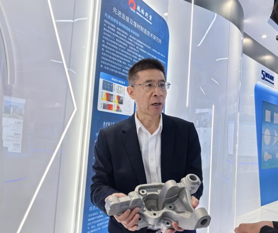 魏桥轻量化研究院院长张海向记者展示铝合金新材料汽车零部件