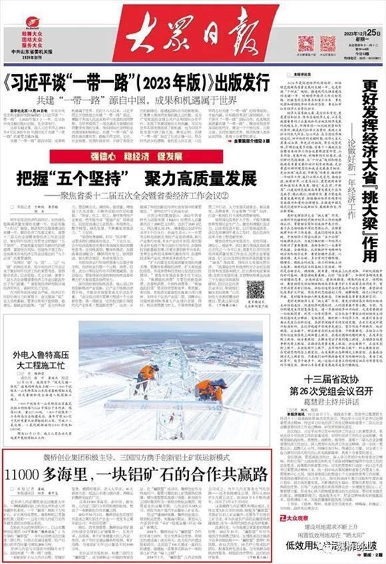 12月25日,《大众日报》头版刊发《11000多海里,一块铝矿石的合作共赢路》,报道了以魏桥创业集团为主导的三国四方“赢联盟”通力合作,创新铝土矿联运新模式,打造一条自几内亚到中国,集多式联运于一体的铝土矿产业合作共赢之路的故事。