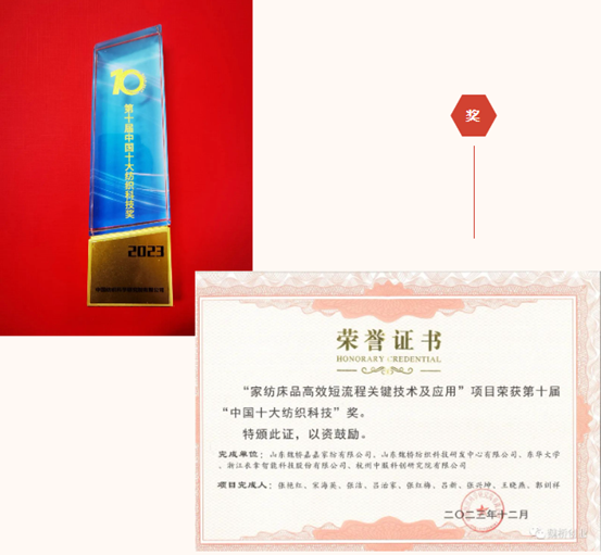 近期,在2023中国纺织科技成果对接峰会暨第十届“中国十大纺织科技”发布会上,发布了2023年度“中国十大纺织科技”获奖成果, 山东魏桥嘉嘉家纺有限公司和山东魏桥纺织科技研发中心有限公司申报的“家纺床品高效短流程关键技术及应用”项目荣获“中国十大纺织科技”奖,魏桥纺织股份有限公司申报的“机织物家纺一次织造成形关键技术及产业化”项目荣获“中国十大纺织科技”·产业推动奖。