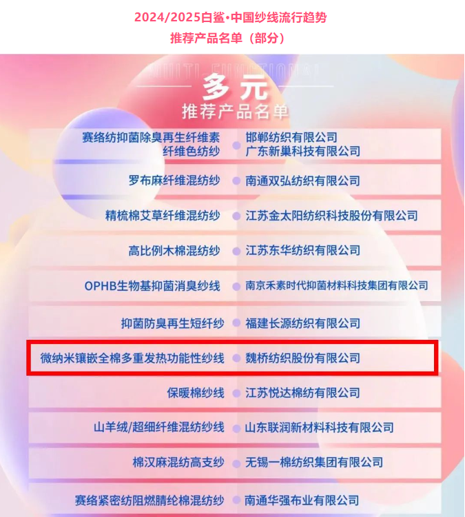 3月7日,由中国棉纺织行业协会主办的“2024/2025白鲨·中国纱线流行趋势发布会”于国家会展中心(上海)8.2号馆圆满落幕。本次发布会高朋满座,吸引了近200人到场参会,获取纱线流行新趋势。魏桥纺织股份有限公司两款纱线产品入选流行趋势推荐产品名单。