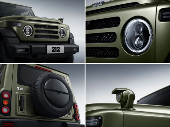 曾经的212,是青涩记忆中值得信赖的伙伴,在中国工业建设中扮演着可靠的角色;如今的212,在继承硬派越野基因的同时将现代理念写入产品设计,为当代消费者缔造更优越的越野体验。外观上,全新212以“传承”与“复古美学”为设计核心,承载历史的记忆,也开启未来的无限可能。新车前脸保留“一拱、二圆、三横、四纵”的产品设计基因,车身侧面线条简洁流畅,整车轮廓方正有力,给人以安全、稳重的视觉感受并展现出简约与纯粹的力量之美。