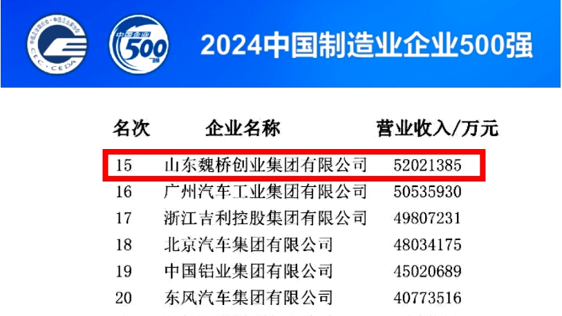 9月20日,在合肥举办的2024世界制造业大会上,中国企业联合会、中国企业家协会发布2024中国制造业企业500强榜单,山东魏桥创业集团有限公司再次上榜,位列第15位。