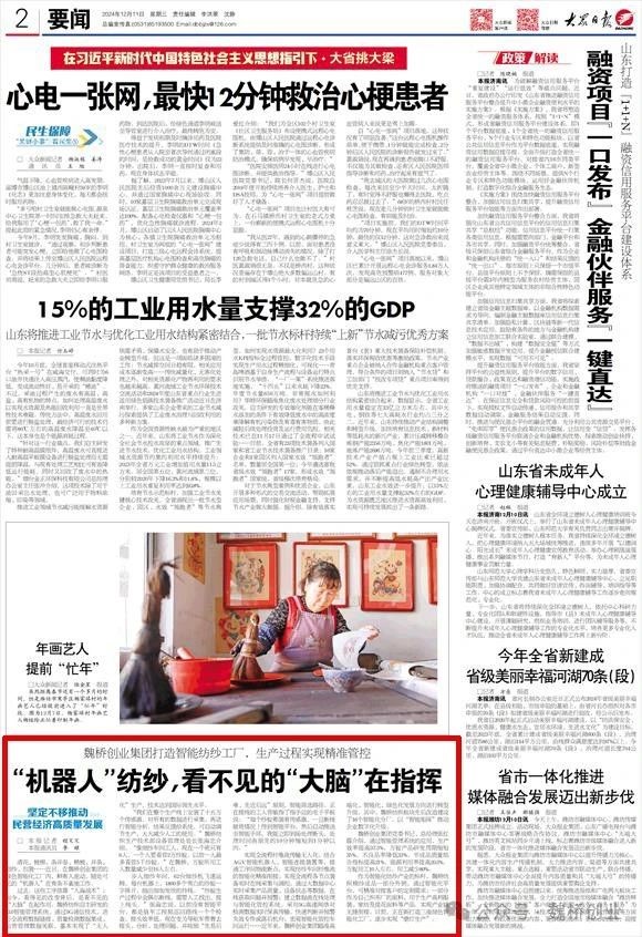 12月11日,《大众日报》刊发《魏桥创业集团打造智能纺纱工厂,生产过程实现精准管控—— “机器人”纺纱,看不见的“大脑”在指挥》的报道,以下为全文内容: